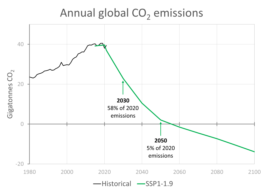 The approach pre-dates the most recent IPCC sixth assessment reports but recommends scenarios in line with the Paris Agreement to limit warming to 1.5°C above pre-industrial levels. This limits the choice of the five scenarios in the IPCC Working Group 1 Report to the first (SSP1-1.9) and the corresponding timeline of carbon emissions is depicted in the diagram below.