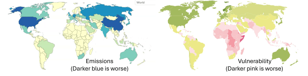 The study material asked, “What would Zacchaeus do in response to the climate crisis?”, and by implication what should we do. The question forces us to acknowledge that we in the Global North are both rich and guilty of theft. The richest 10% of the world are responsible for nearly half of global emissions each year whilst. The poorest 50%, mostly in the Global South, are only responsible for abut 10% yet are those most affected by the impacts of climate change (Oxfam). The two maps below are coloured to represent the countries responsible for the greatest emissions since the industrial revolution (left) and those that are most vulnerable to climate change (right). You can see that they are very nearly inverted images of one another. Those who have done least to cause the problem and those who are suffering the most form its effects.